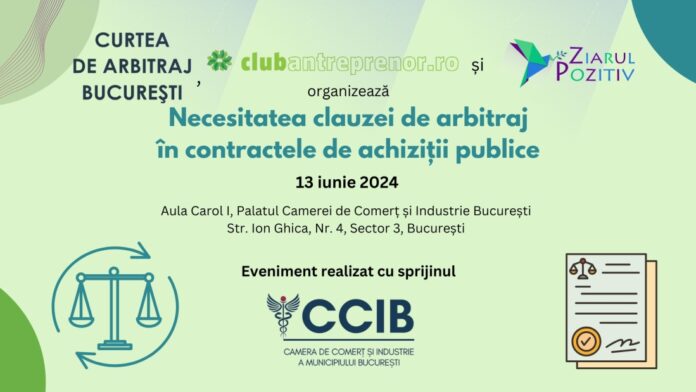 Curtea de Arbitraj București, Club Antreprenor și Ziarul Pozitiv organizează joi, 13 iunie 2024, începând cu ora 9:30, conferința cu tema „Necesitatea clauzei de arbitraj în contractele de achiziții publice”. Evenimentul, desfășurat cu sprijinul Camerei de Comerț și Industrie a Municipiului București, va avea loc în Aula Carol I (Palatul Camerei București, Str. Ion Ghica, nr. 4).