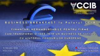 Camera de Comerţ şi Industrie a Municipiului Bucureşti organizează marți, 13 februarie, începând cu ora 9:00, în Aula Carol I a Palatului CCIB (Str. Ion Ghica nr. 4), o nouă ediție a Business Breakfast la Palatul CCIB, cu tema „Finanțări nerambursabile pentru firme. Cum transformi o idee într-un business de succes, cu ajutorul fondurilor europene”. Invitatul special al evenimentului…